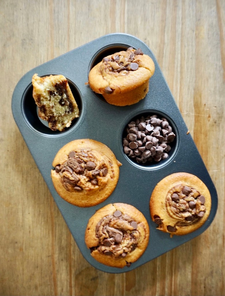 So as I said, I tried to make them even more chocolatey by adding some melted chocolate to the middle of the muffin. So basically adding one layer of muffin, a bit of chocolate with a swirl and then another layer of muffing with more chocolate swirl, and that on top of the chocolate chips!