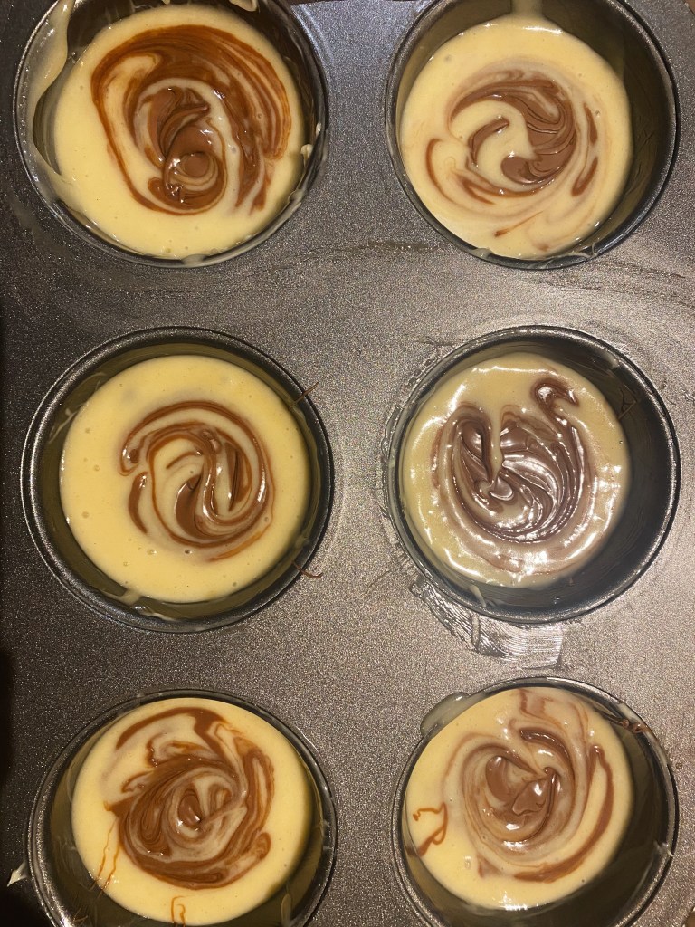 - Grease some muffin trays or put the muffin cases and fill them half way through, add a generous drop of the mixed chocolate and swirl with a toothpick or a thin knife. If the mixture is too white or not swirly enough, add a bit more.