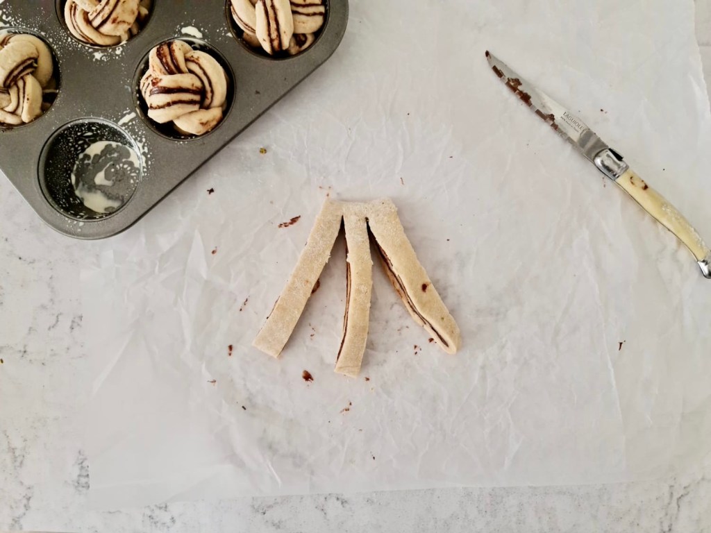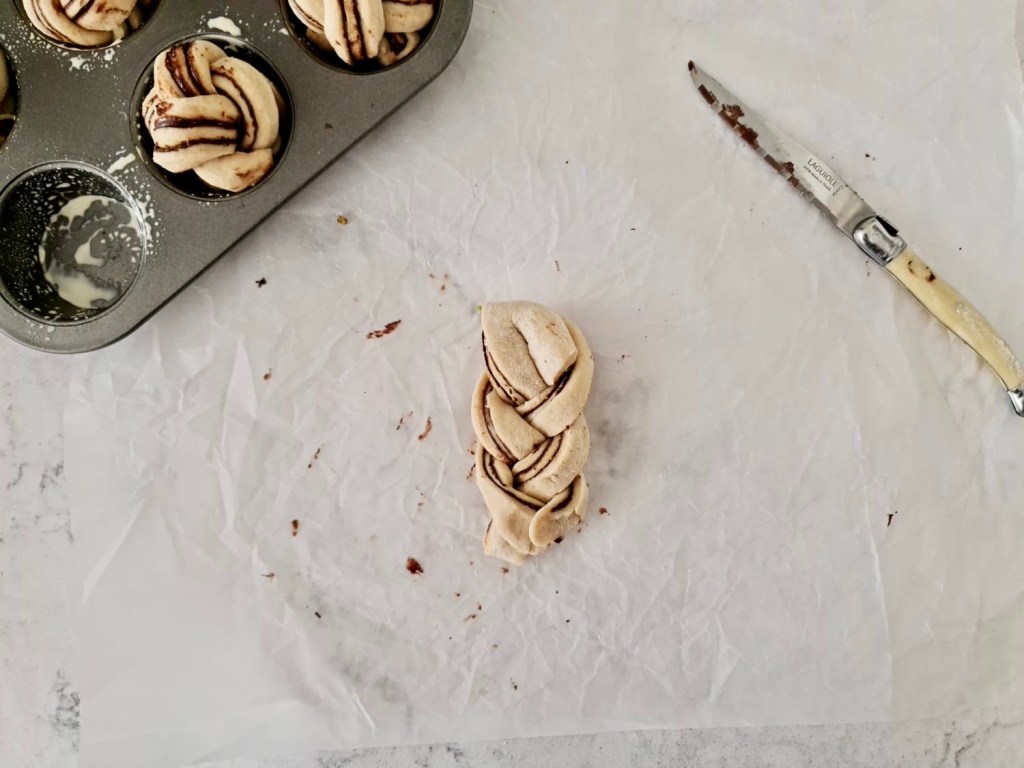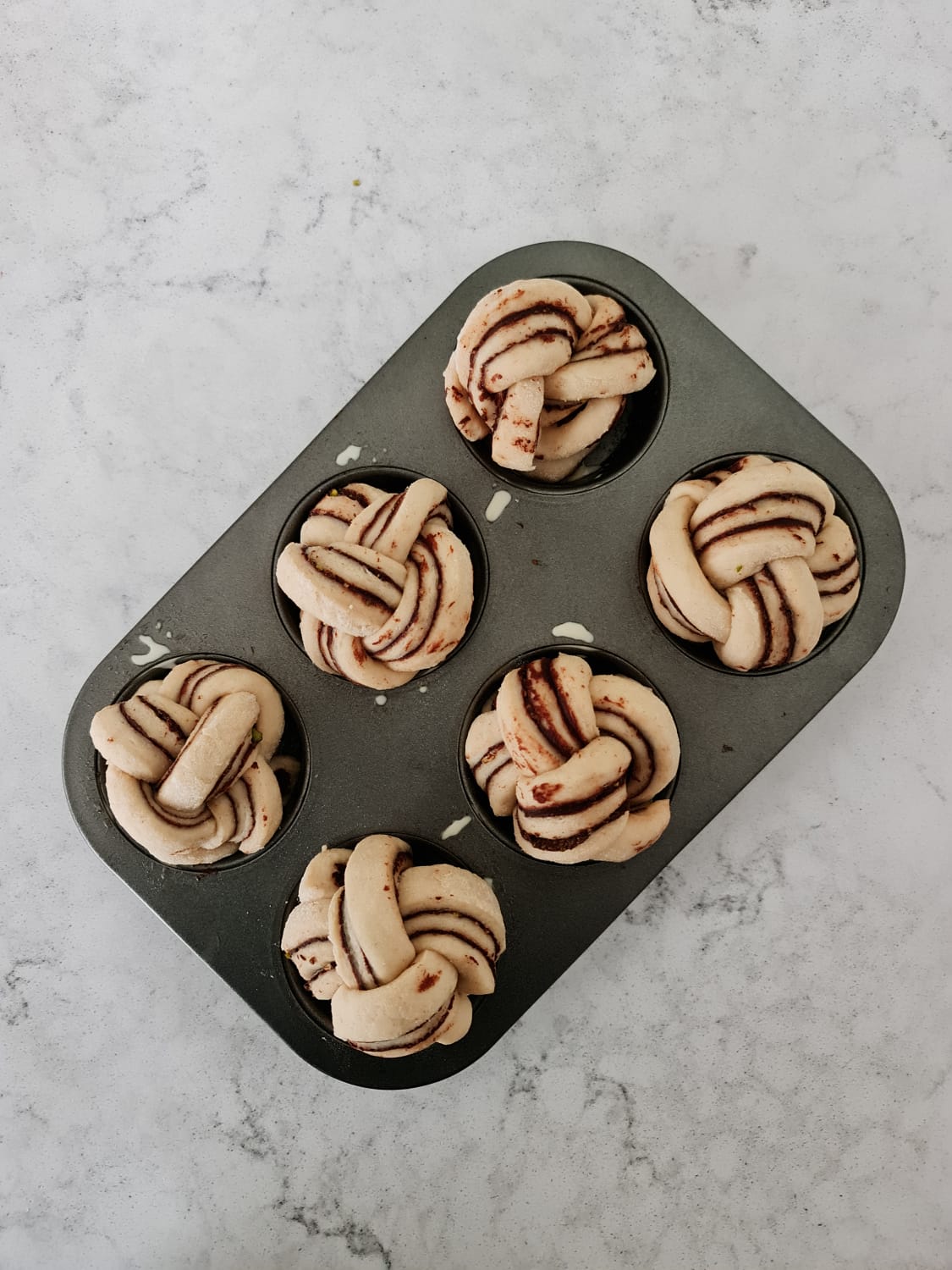 - Fold the braid on itself into a ball, don’t stick it together or anything similar, we just want a little braid ball. Put each one in a greased muffin tray.