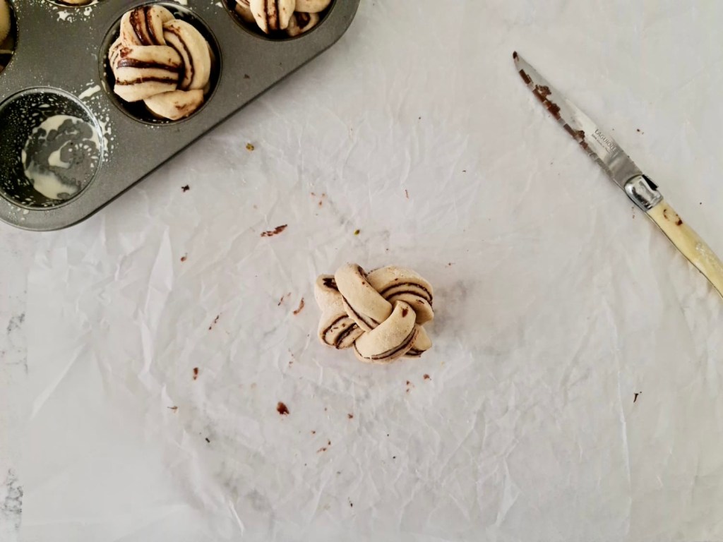 10. Fold the braid on itself into a ball, don’t stick it together or anything similar, we just want a little braid ball. Put each one in a greased muffin tray.