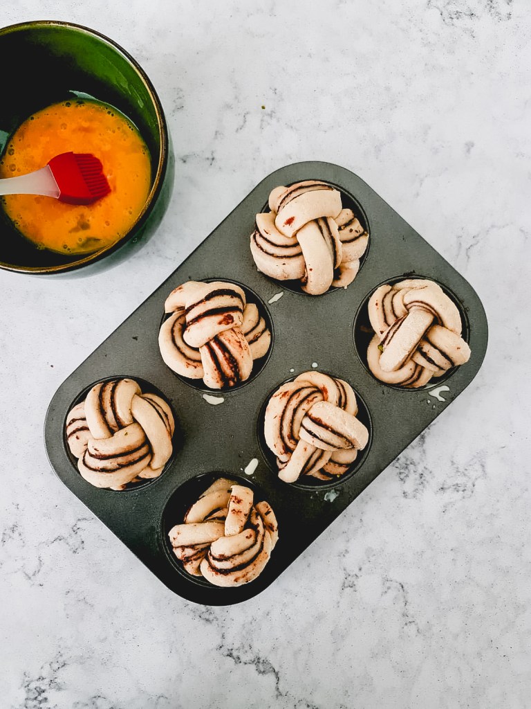 12. After an hour, beat the egg and brush it over the knots and cook them in a preheated oven for 18-20 minutes, until they are nice and brown.