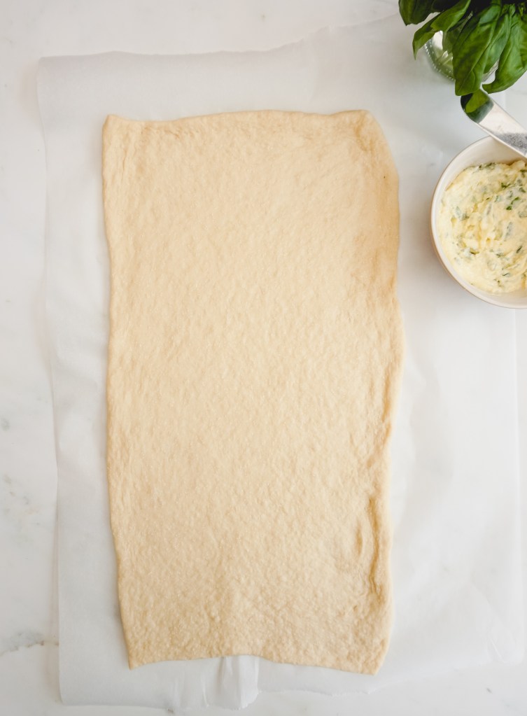 - Take your dough and roll it on a floured surface, with a rolling pin, make the shape of a rectangle, if you are struggling with the rectangle shape, simply use a pizza cutter or a knife to cut the edges.