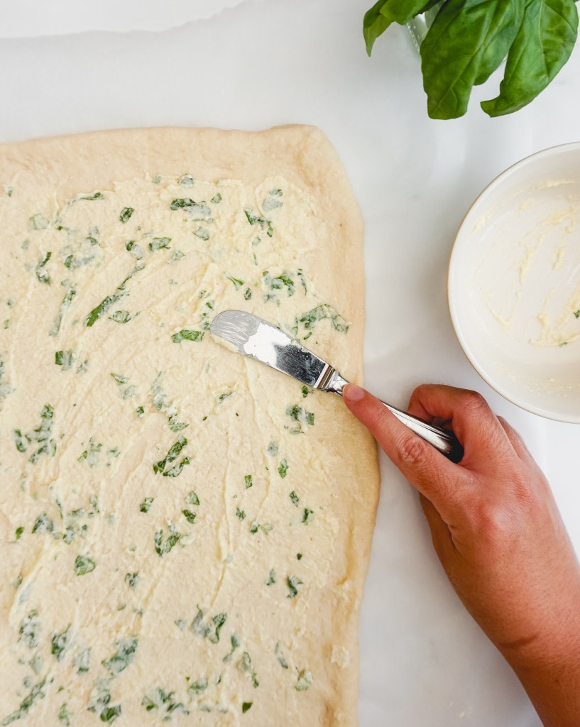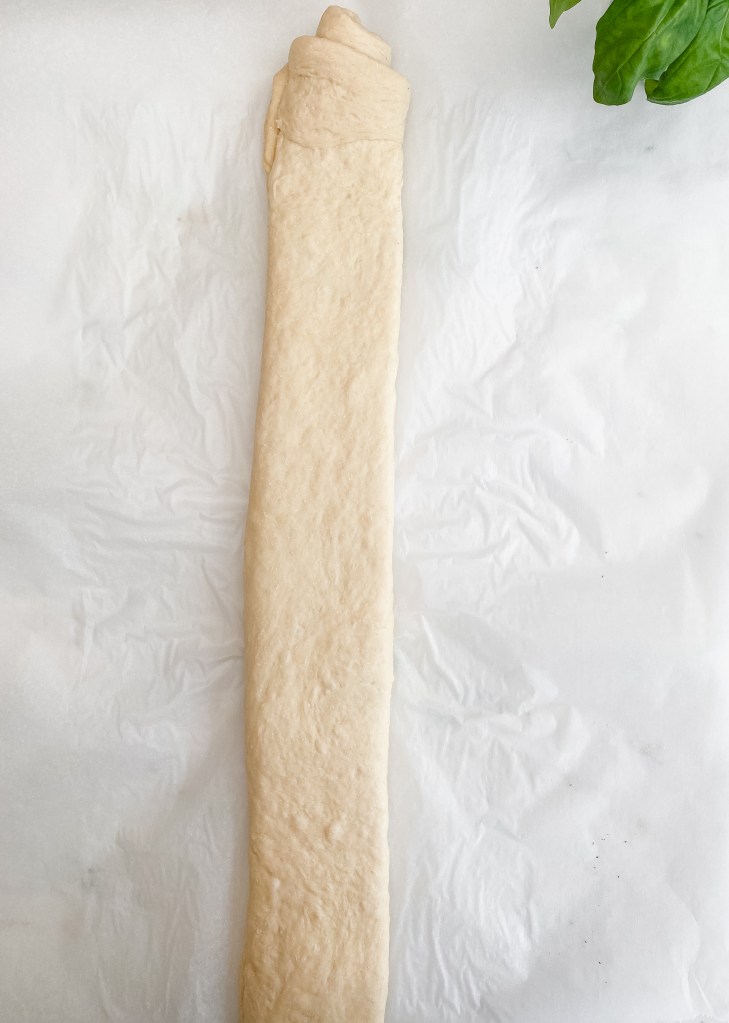 - Roll the dough from one of the long edges of the rectangle into the shape of a log.