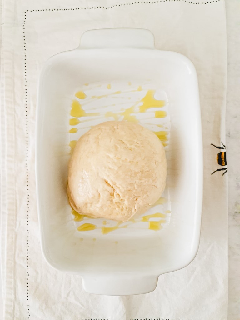 - Once the dough has a nice sticky consistency, give the dough a ball shape and put it in a container. You should put it in a container of whatever shape you want to focaccia to be, mine was a rectangle, this is important as it will help the focaccia have the right shape.