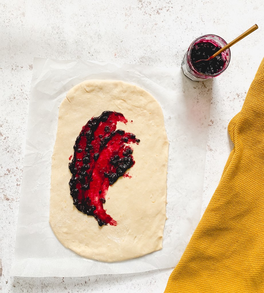 - Spread the blueberry jam all over the dough and start rolling it with your hands from the bottom to the top, forming a long log. Cut the top and bottom edges of the log.
