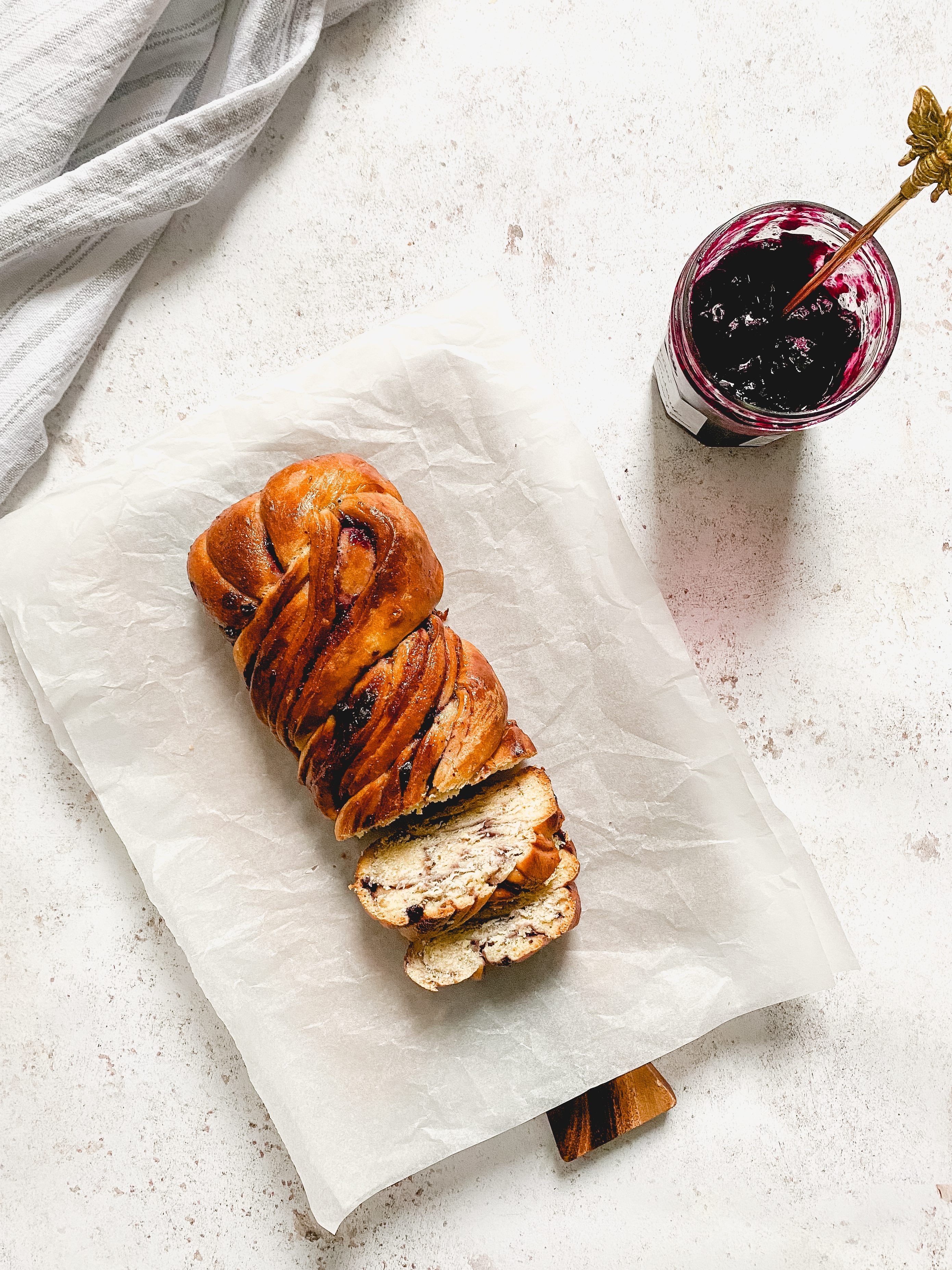 All you need to make this bread is: milk, bread flour, sugar, lemon zest, instant yeast, salt, butter, vanilla extract, egg and blueberry jam.