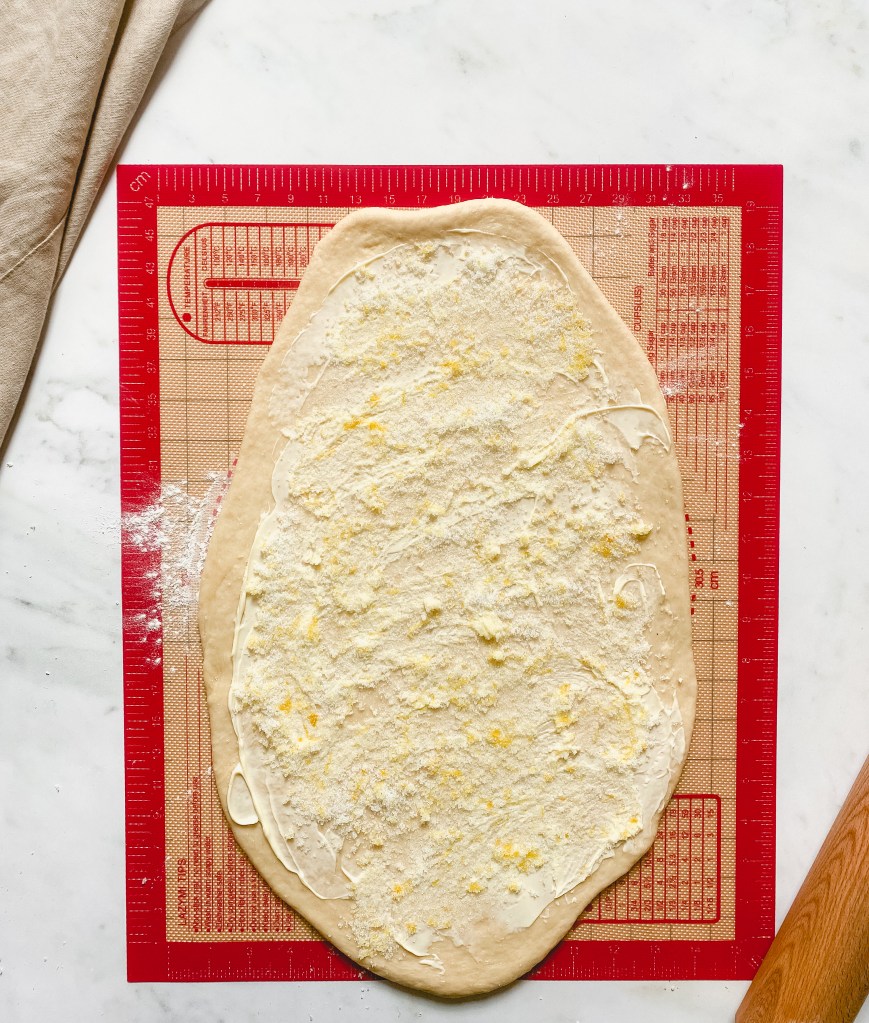 - Once shaped, spread the butter over the whole thing and then sprinkle the mix of sugar and lemon.