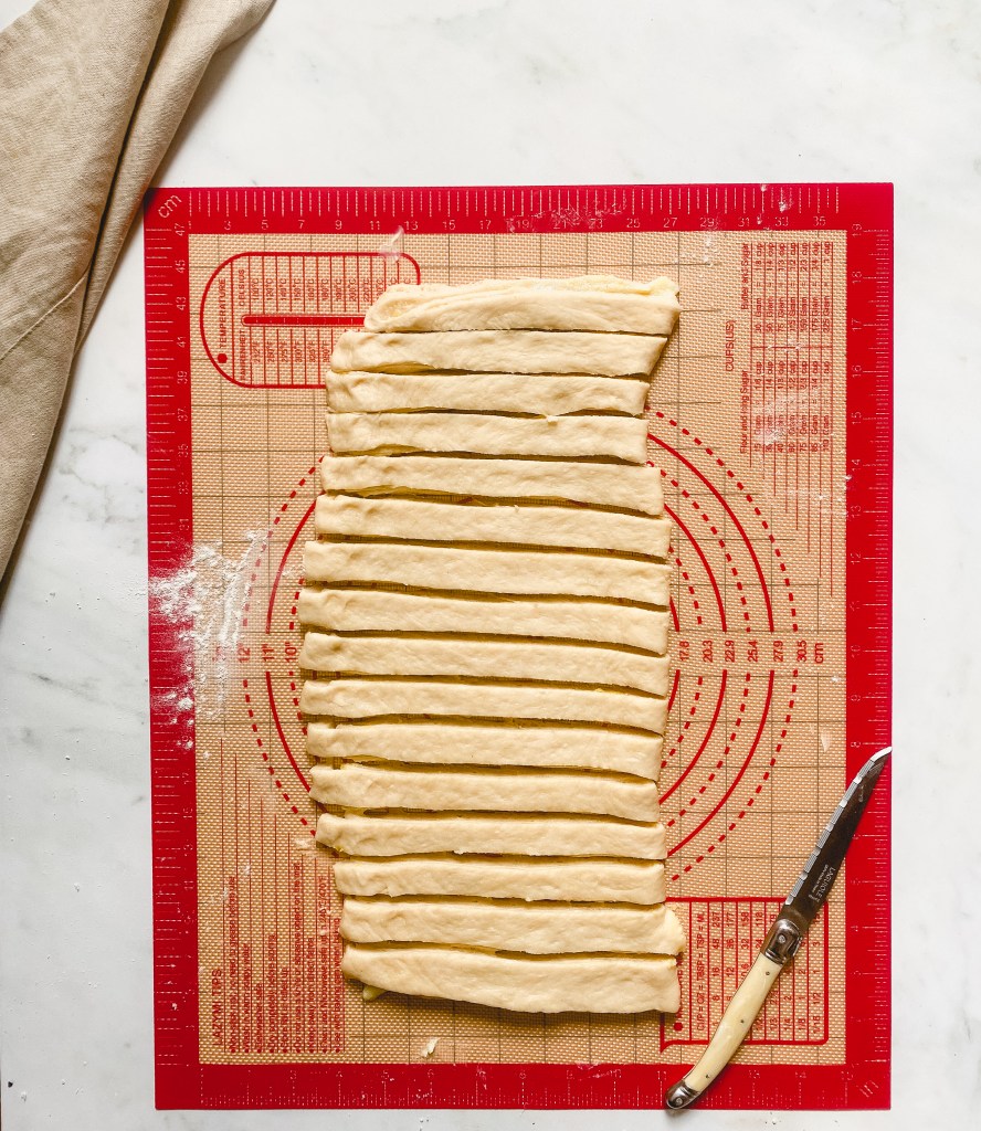 - Cut the dough into horizontal strips. The strips should be about a finger’s wide.