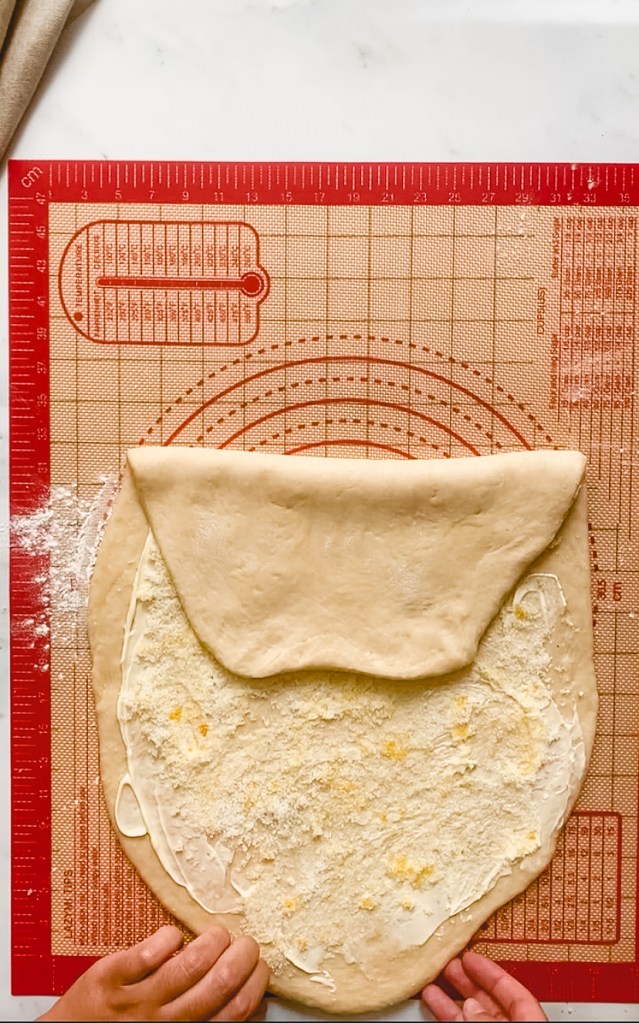 - Now fold the dough, first grab the bottom part of it and take it to the middle of the rectangle, then take the top part and place it above the already folded bottom one.
