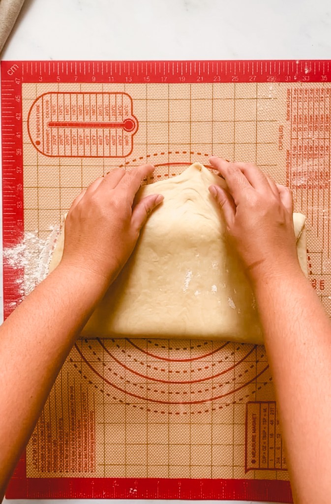- Fold the dough, first grab the bottom part of it and take it to the middle of the rectangle, then take the top part and place it above the already folded bottom one.