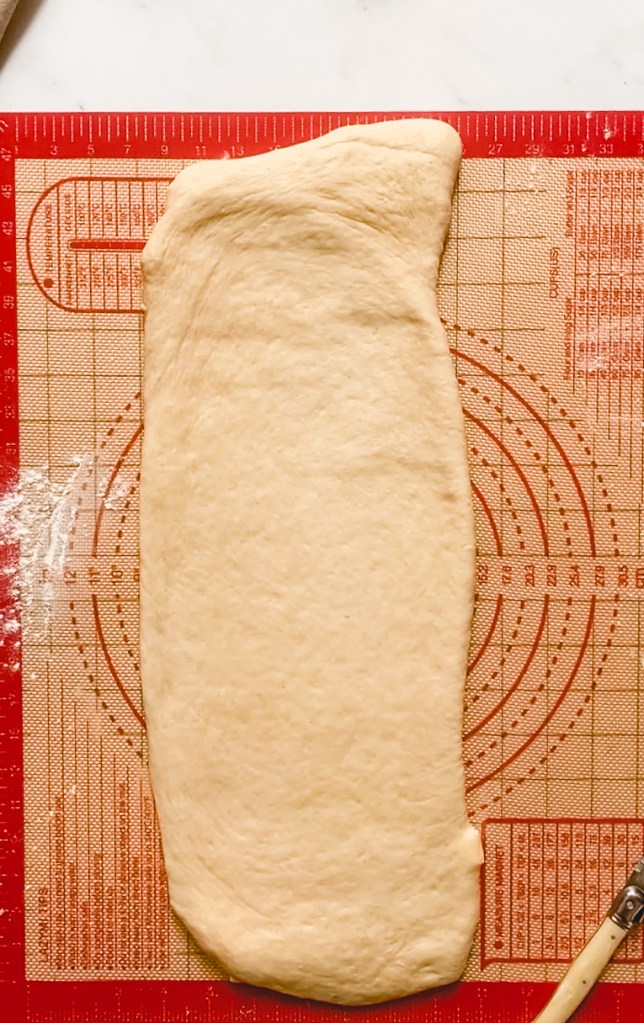 - After that, turn the dough 180 degrees so it will be vertical rather than horizontal, so the short side of the rectangle will be close to you rather than the long side. Roll it with a rolling pin until you have a long rectangle.