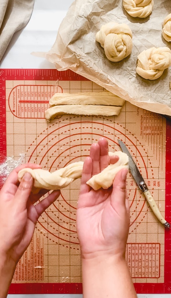 - Take 2 strips and twist them together. Then, hold them with your thumb and your index and move the dough around your fingers. After that, hide the end of the dough under the circle created around your index and thumb.
