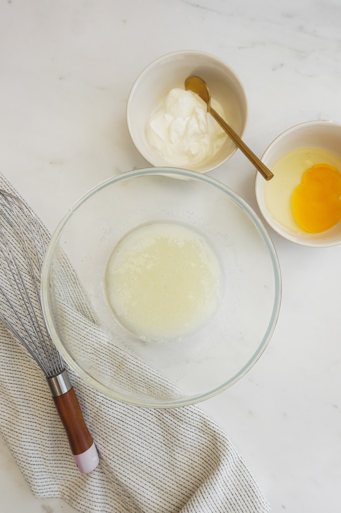 All that is needed for these is: vegetable oil, sugar, warm milk, eggs, vanilla extract, greek yoghurt, baking powder, salt and flour.