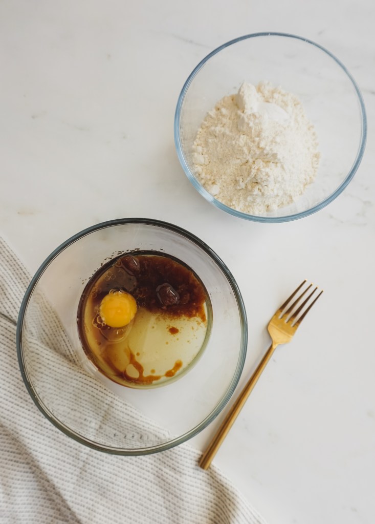 - Now we will move onto the crumble. In a bowl, mix the sugars, egg, vegetable oil and vanilla, then add in the flour. Mix them with a fork, it will have a grain-y consistency. Place it in the fridge and leave both the crumble and the muffin mix in the fridge for an hour. This is very important and it will keep them from overflowing.