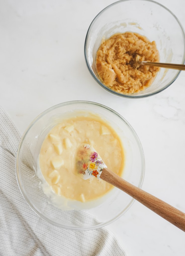 Once that is done, add in the flour and baking powder and mix with a spatula just until combined, be careful not to overmix. Lastly, add in the apples and mix then carefully. Once that is done place the mix in de fridge.