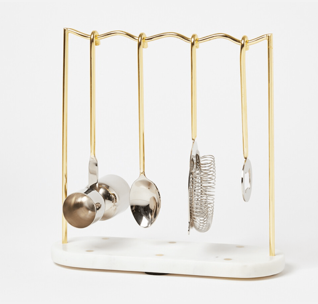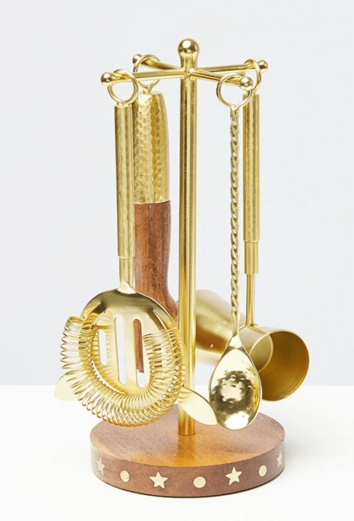 From Oliver Bonas: Wooden Star Base Bar Tools Set (£55.00), Gold Metal & Marble Dots Bar Tools Set (£59.50)
