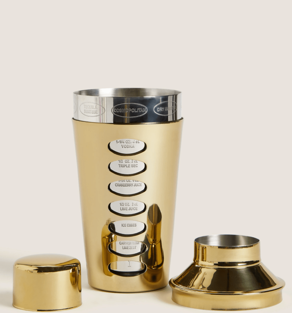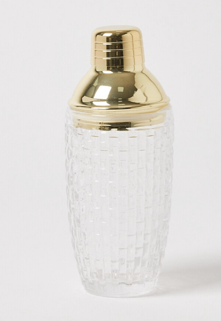 M&S Cocktail Shaker (£19.50), Oliver Bonas Fiesta Gold Metal & Glass Cocktail Sh aker (£22.50), Becky Broome Personalised Cut Glass Cocktail Shaker (£38.75)