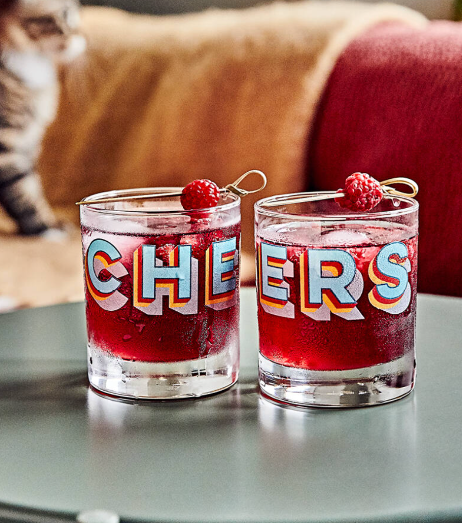 Becky Broome Personalised Retro Slogan Tumbler Glass (£23.75), Forest & Co. Set Of Two Ribbed Gold Rimmed Martini Glasses (£24), Anthropologie Set of 4 Claus DOF Glasses (£50.00)