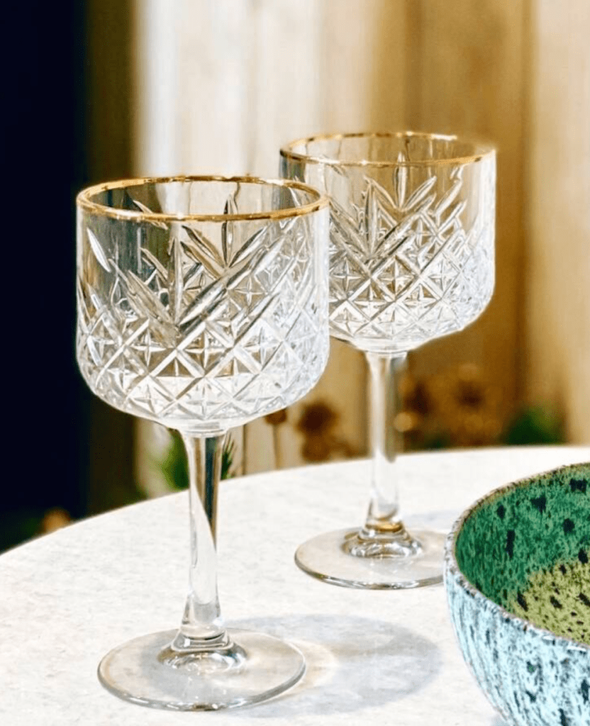 Oh So Cherished Gold Rim Fluted Stemless Gin Glass (£12), Becky Broome Personalised Scalloped Glass (£27.75), The Forest & Co. Set Of Two Gold Rimmed Cocktail Glasses (£32)