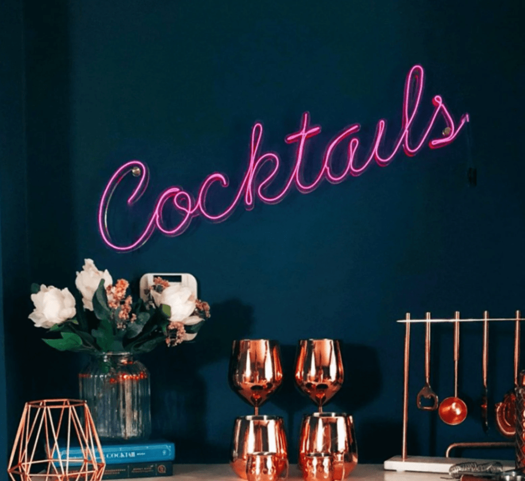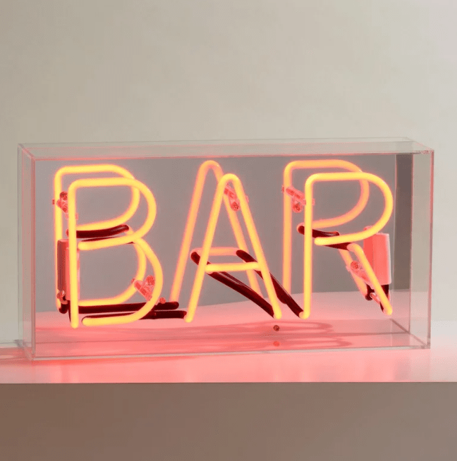Contempohome Cocktails Neon Sign (from £84.99), Oliver Bonas Bar Neon Sign (£95), RueLighting Champagne? LED Neon Sign (from £169.00)