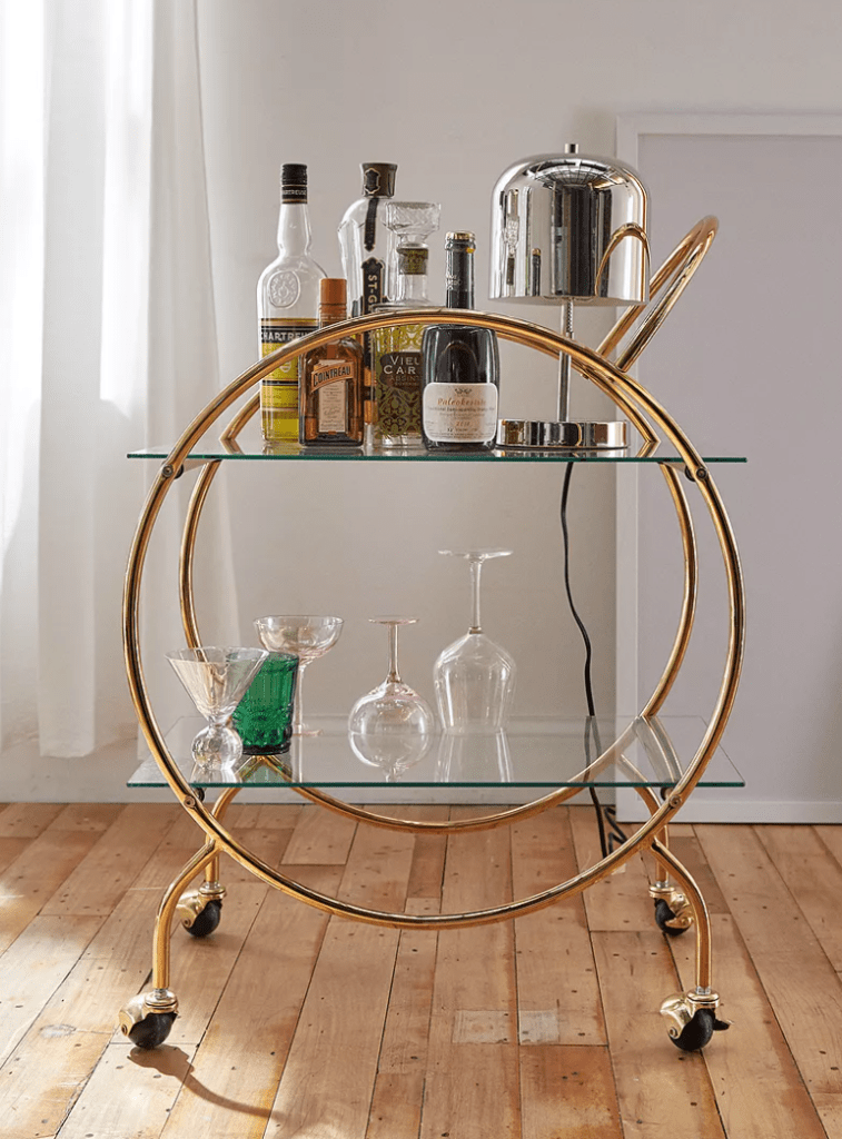 EsmeHome Round Metal Gold Finished Drinks Trolley (£164.99), Urban Outfitters Selene Bar Cart (£149.00), Atkin & Thyme Stirling Drinks Trolley (£299.00)