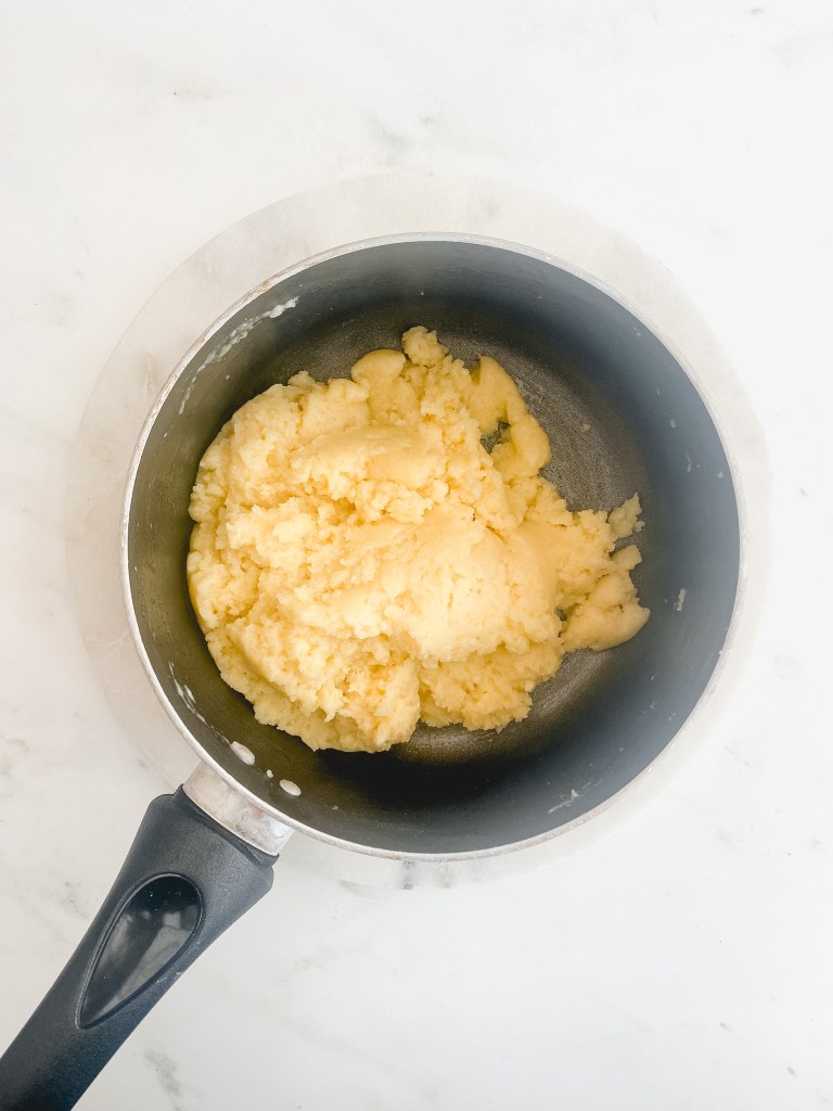 - After making the filling, you should be closer to the hour needed for the craquelin, so start making the choux pastry. The first thing to do is to mix the butter, sugar, salt, milk and water in a pot and cook it until the butter has dissolved completely and starts simmering, then, turn off the heat and add the flour. You will have to stir it vigorously with a wooden spoon for a couple of minutes until it forms a pale paste. Set aside for a couple of minutes so it cools down slightly. Then, beat the egg separately and add it very slowly to the mix. You may not need the whole egg depending on its size, I use large eggs and there is always some left. Using the dough attachment of a hand mixer, add in the eggs bit by bit. After adding small amount, mix with your hand mixer for 20-25 seconds and then add again. The mix will first look curdled but will come together as you keep adding end and mixing. You will know it’s ready when it forms a thick paste that may start “climbing” up the hook of your mixer.