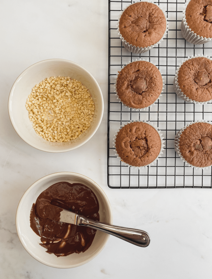 - To assemble, spread Nutella on top of the cupcake, then, dip it into the chopped hazelnuts (I put mine in a bowl), pipe the icing and finally top with an extra Ferrero Rocher.