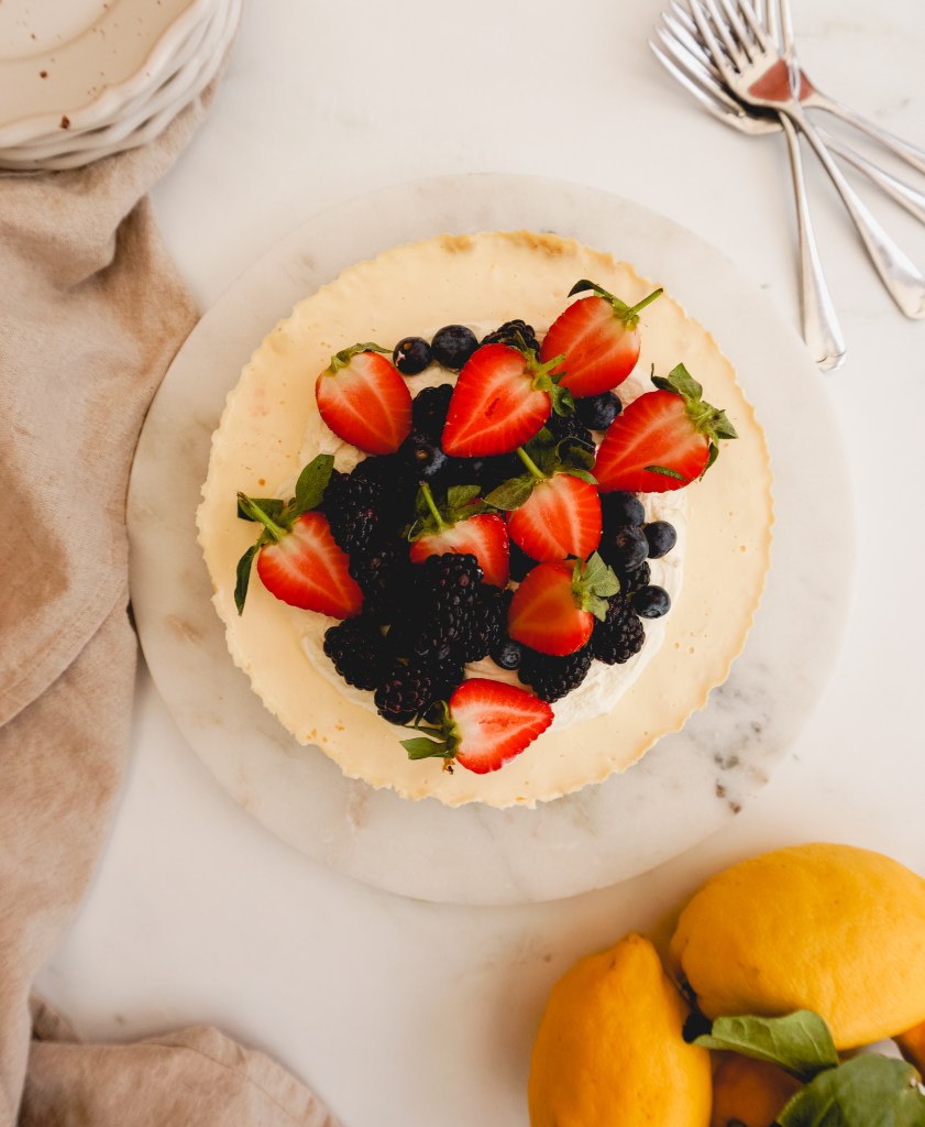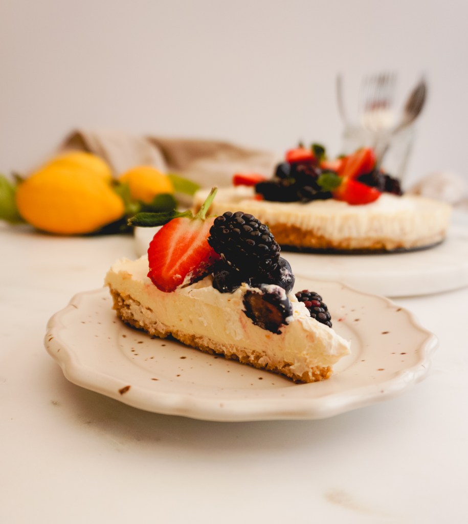 If you’ve been here for long enough you’ll know by now that I looooove lemon and tbh I love a no bake cheesecake. To be completely honest, I am really not a big fan of any other citrus fruit apart from lemon, so that’s why I use it so much! But, since we are transitioning into the warmer months, I am so happy to be adding berries to my lemon desserts and also to start cooking with other seasonal fruits (hello peaches!)