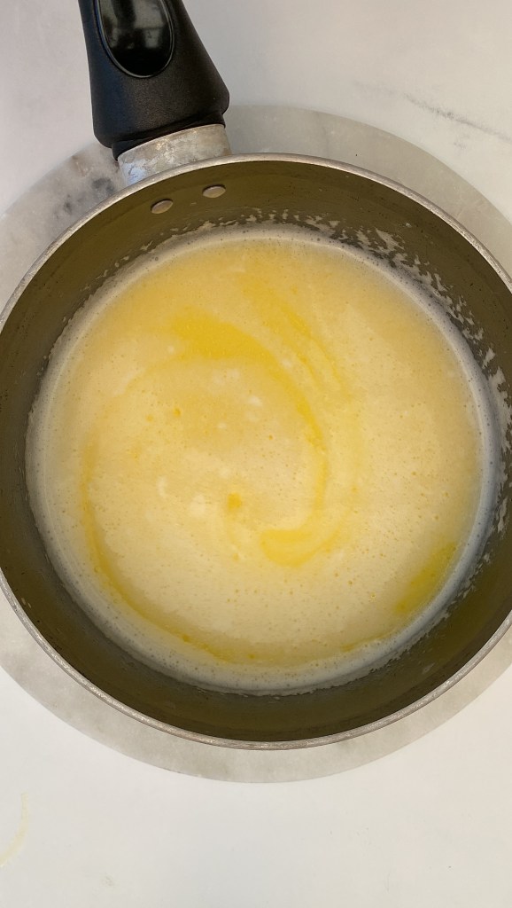- Melt the butter in a pan with the water, milk, sugar and salt until the butter is melted and the mix is simmering.