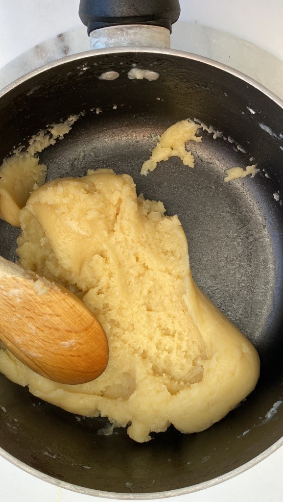 - Transfer the mix into a bowl and allow it to cool off for a couple of minutes, this will keep the egg that we are about to add from cooking in the hot mix. Beat your eggs together in a separate bowl and then start gradually adding them to the batter mixing them with the dough attachment of your hand mixer, allow 30 seconds between additions. The mix will look curdled at first, but keep mixing, it will slowly become a really soft, shiny and sticky batter, if you touch it with your hands it should stick between your fingers. You may not need all the eggs, and if you have any left over, keep it for later.