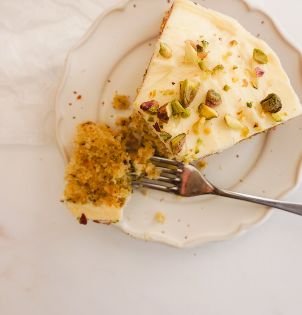 - Spread the frosting over the cake and decorate with extra pistachios. Enjoy!