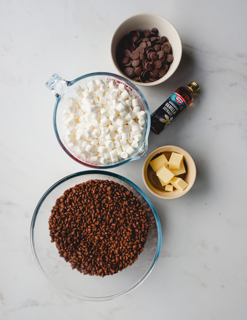 - Mini marshmallows – this recipe calls for double marshmallows, some to be melted with the butter and added to the Rice Krispies and some to be added directly to the mix so they can slightly melt with the hot chocolate