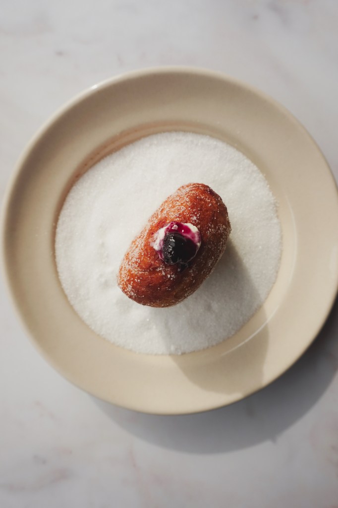 - To assemble, make sure your donuts have cooled down completely, then insert a knife into each donut to create a hole that goes all the way through it without breaking the other side. Start by filling them with the cream cheese filling half way through, then add the blueberry jam all the way to the top and finish it off by adding a small amount of cream. Enjoy!