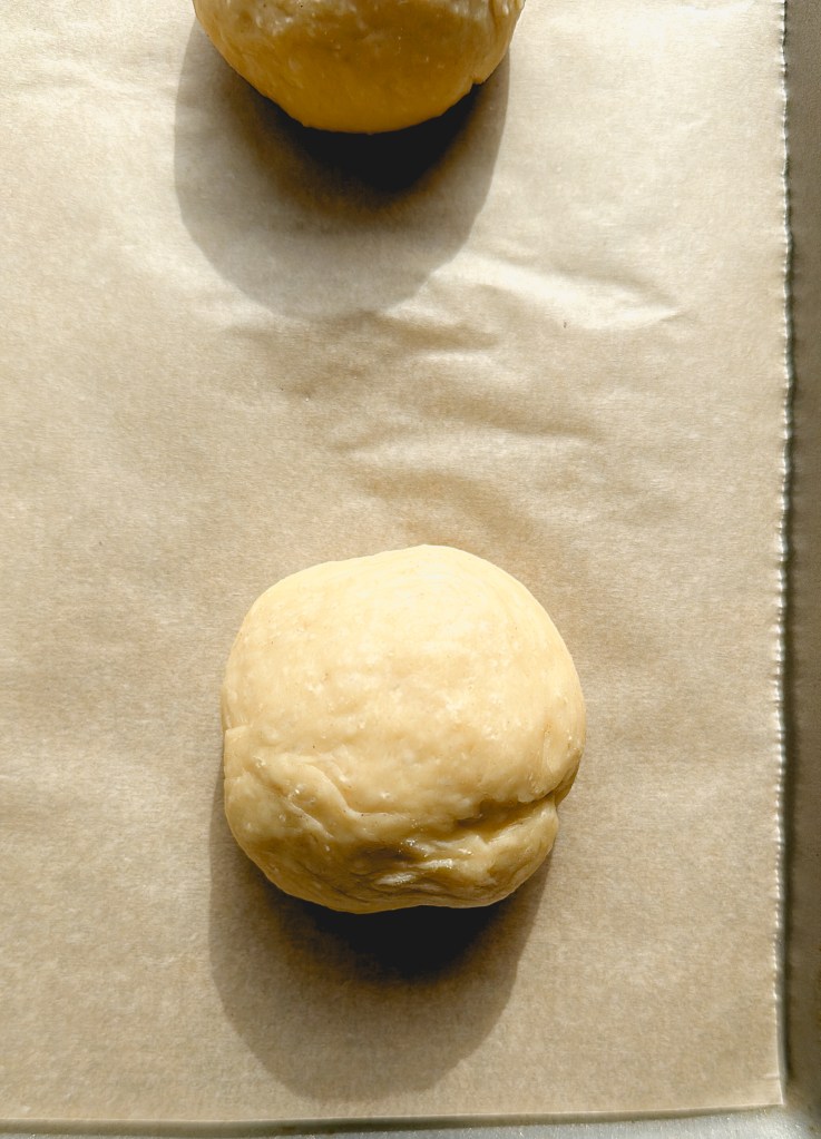 - Working with one piece at a time, start by flattening it slightly into a disk and then slowly bring the edges into the centre in a clockwise motion and pinch them together to “close” the ball. Then, roll the ball around in your hand or on a clean work surface to create tension on the dough and seal the bottom of the ball. If you have any dough left, you can put it together and create an extra smaller (but cute) donut.