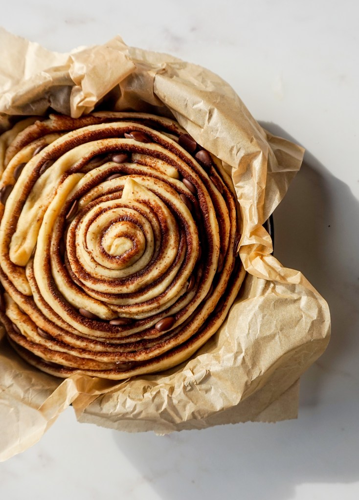 - Using a sharp knife or a pizza cutter, cut the dough into six to seven 5 cm wide strips. Starting on one of the edges, roll up one strip, then, take that rolled up strip and place it on top of another strip, which you will then roll up again. Repeat the the process with every strip until you have one giant roll, some chocolate chips may fall out as you roll the strips, so just add them between the layers of dough. Place the giant cinnamon roll into a greased 22-23 cm springform cake tin.