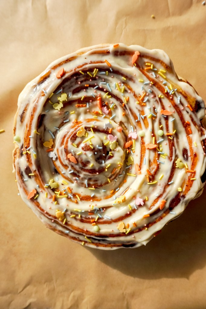 - Allow the cinnamon roll to raise for a further hour until doubled in size.