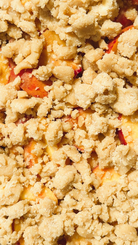 - Once the shortbread is ready, take it out of the oven and let it rest for 5 minutes, leave the oven on while this happens. After 5 minutes, layer the peaches on top of the warm shortbread making sure they are evenly spread over it. Then, top them with the streusel. The streusel should have solidified and you should be able to crumb it with your fingers, if it’s still soft, put it in the freezer for a few minutes to allow it to cool faster.