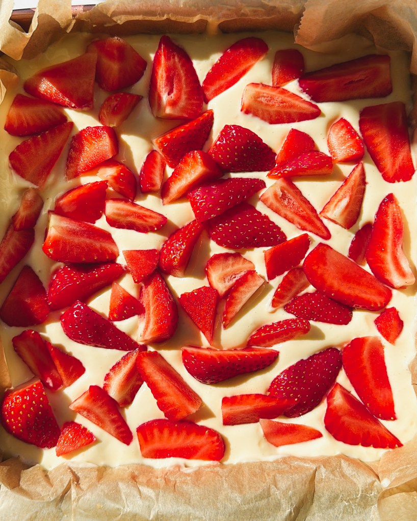 - Once the shortbread is ready, take it out of the oven and let it rest for 5 minutes, leave the oven on while this happens. After 5 minutes, pour the cheesecake mix over the shortbread and smooth it out into an even layer. Top evenly with the strawberries and finally, top with the streusel.