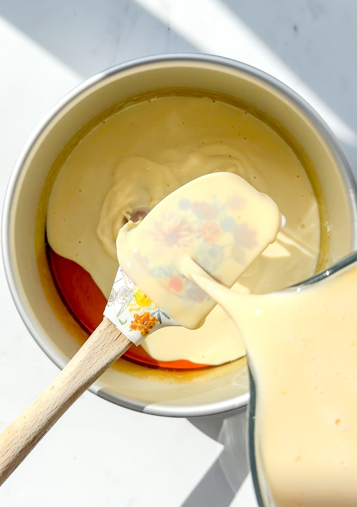 - Pour the egg mix over the caramel. Use a spoon or spatula to pour the mix over, so it doesn’t hit the caramel directly, this will help not break the caramel coating (see picture above for visual explanation).