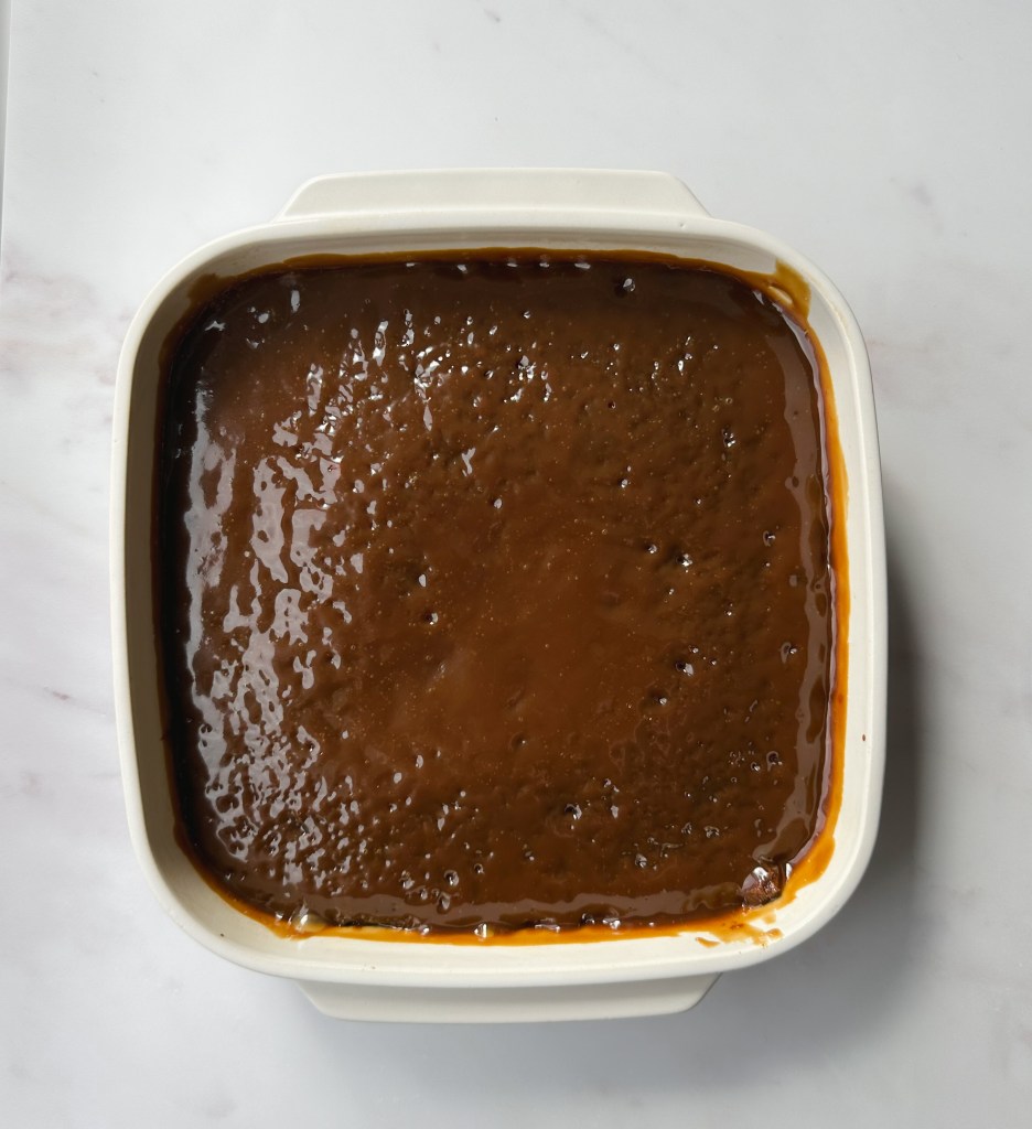 - As soon as the pudding is out of the oven, pierce the cooked sponge all over with a skewer or a toothpick making sure it’s pierced all the way to the bottom of the dish and pour just over half of the warm sauce, making sugar you go all the way to the edges so the whole pudding is covered in a sticky glaze. I used a spatula to carefully create a small gap between the edge of the pudding and the dish so the sauce also soaked the side of the edges all the way to the bottom. Keep the remaining sauce aside to use when serving.